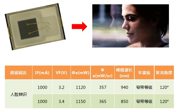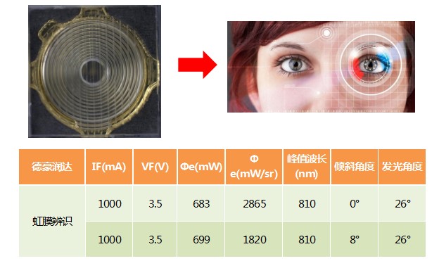 德豪润达器件虹膜识别LED采用810nm镀金大功率封装,产品匹配国际大厂规格水平: